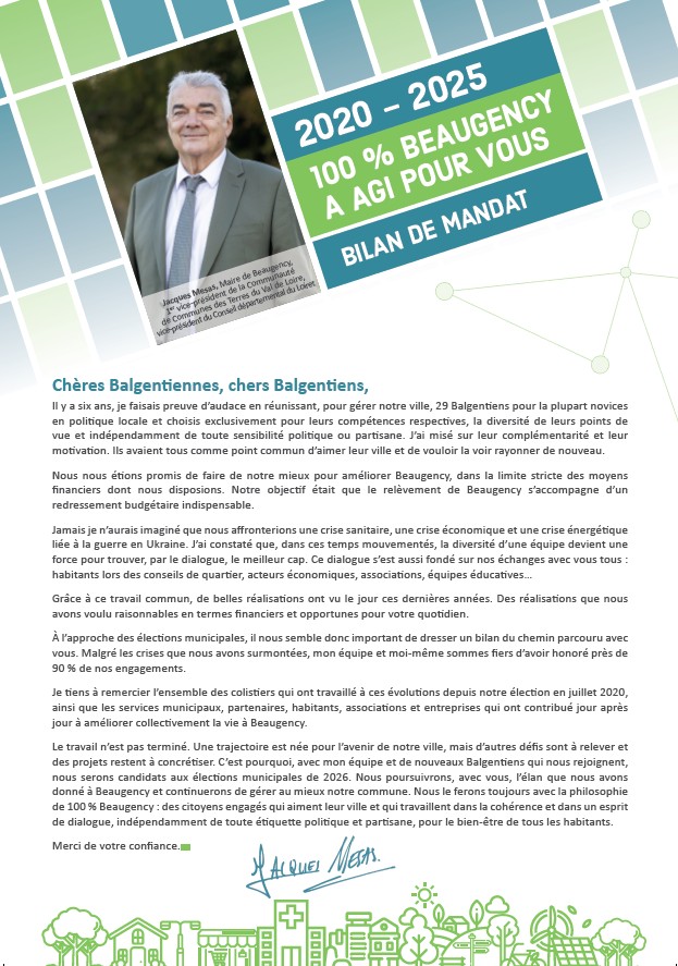 Autour de Jacques Mesas, maire de Beaugency depuis 2020 et vice-président du Conseil départemental du Loiret, nous rassemblons une équipe compétente et engagée pour gérer notre ville et s’investir au sein de la communauté de communes.