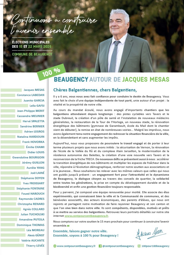 Autour de Jacques Mesas, maire de Beaugency depuis 2020 et vice-président du Conseil départemental du Loiret, nous rassemblons une équipe compétente et engagée pour se mettre au service des Balgentiens afin de gérer notre ville et s’investir au sein de la communauté de communes.